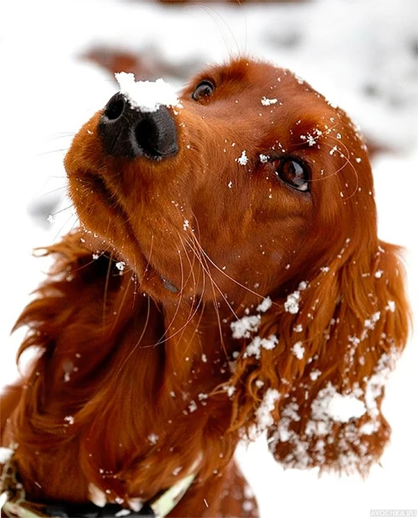 Картинка с замечательной собачкой породы спаниель, которая первый раз увидела снег. Действительно потрясающее явление зимой. Скачать аватар с собакой в снегу.