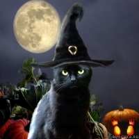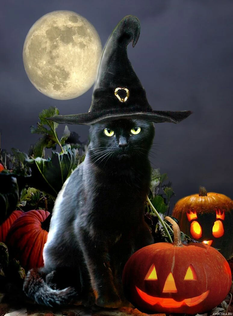 Картинка с черным котом в колпаке на фоне полной луны и хэллоуинской тыквы. Скачать праздничную аватарку с наряженным котом в остроконечную шляпу.