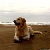 Картинка с замечательной собакой породы голден-ретривер с чудесным характером. Милейший пёс лежит на песке на пляже и ждет, когда его отпустят поплавать, ведь они большие любители поплескаться в воде. Скачать аватар с золотистым ретривером.