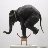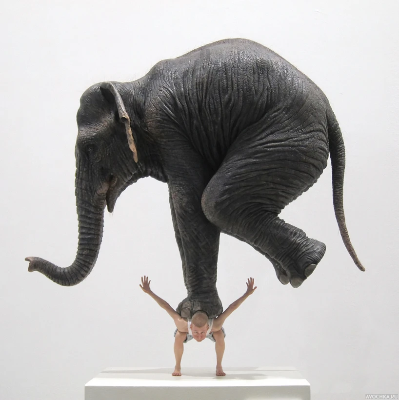 Удивительная аватарка с человеком, на спине у которого стоит огромный слон. Картинка настолько не реалистична, что сложно поверить что человек способен это выдержать. На самом деле на фото изображена скульптура, где человек балансирует вес слона у себя на спине. Скачать аватарку с большим слоном на человеке.