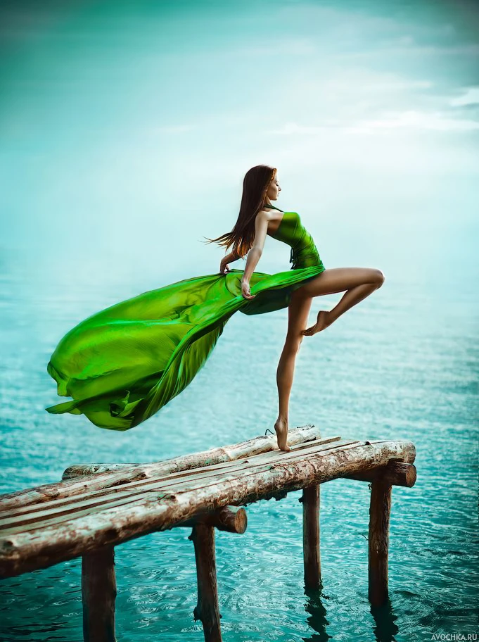 Картинка с длинноволосой девушкой в красивом зеленом платье, которая грациозно стоит на на деревянном пирсе, подняв ногу. Яркий образ девушки на фото сочетает в себе легкость и свободу. Аватарка идеально подойдет для контакта, скайпа и различных женских блогов.