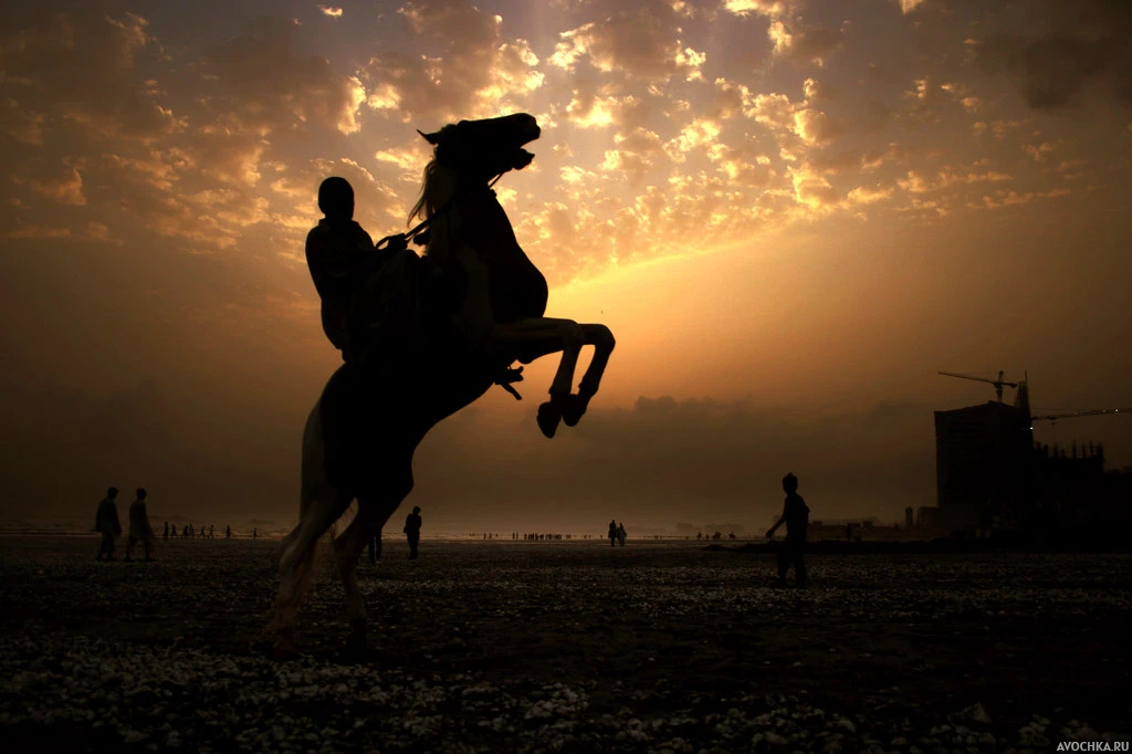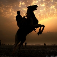 Картинка с силуэтом всадника на коне на фоне восхитительного заката. Лошадь стоит на задних лапах, а всадник держится на ней сверху. Аватарка с силуэтом всадника на прекрасном золотистом закате не оставит равнодушными личностей, которым нравятся наблюдать за последними лучиками солнца. Скачать аватарку с силуэтом всадника.