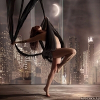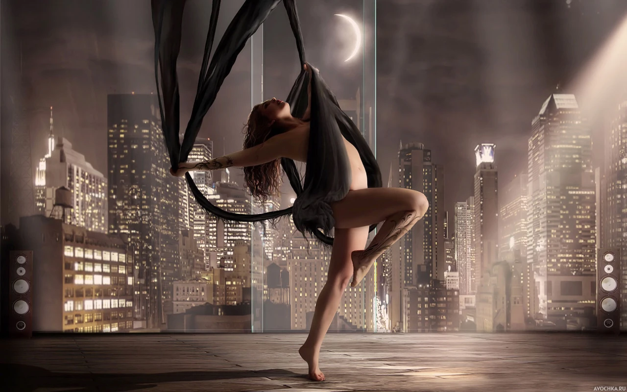 Картинка с одинокой девушкой, которая решила на ночь глядя устроить зажигательные танцы. Прекрасный вид из окна на небоскребы и полумесяц. Аватарка подойдет для безбашенных девушек, которые всегда знают чем заняться. Скачать картинку с танцующей девушкой.