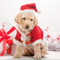 Очаровательный щенок лабрадора в красивом новогоднем наряде. Фото с замечательным лабрадорчиком в костюме деда мороза.
