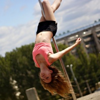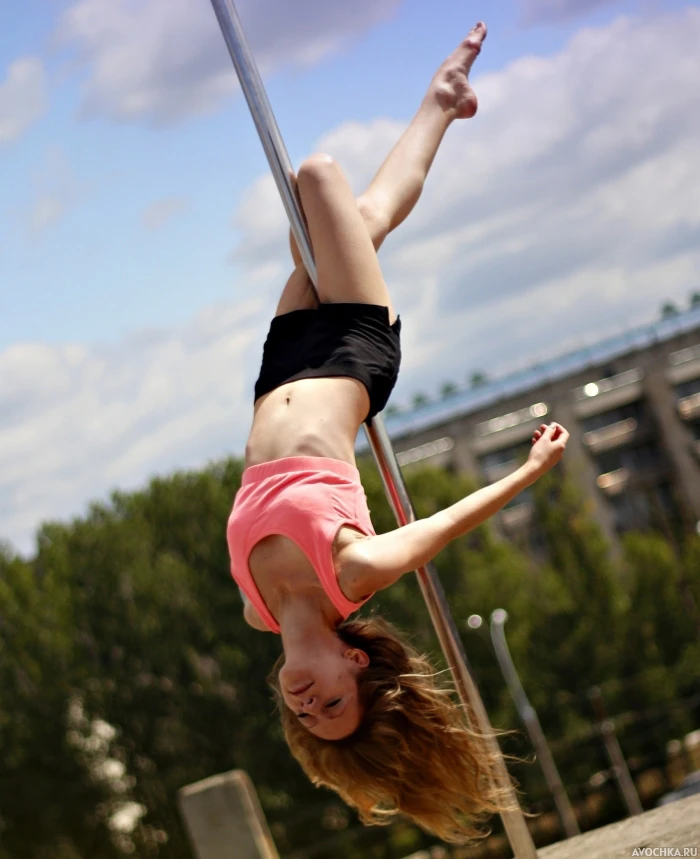 Картинка с девушкой в розовом топике на пилоне. Pole Dance - красивая художественная акробатика на пилоне, которая включает в себя силовые физические упражнения. Скачать аватарку с девушкой на пилоне.