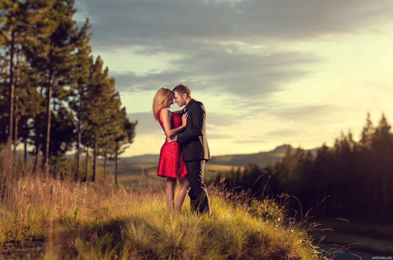 Картинка с замечательной влюбленной парочкой на природе. Парень обнимает девушку блондинку в красном платье. Картинка подойдет для аватара на тематических форумах и блогах. Скачать аватарку на тему любви бесплатно.