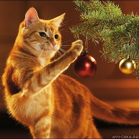 Прикольная картинка с рыжим котом, который наряжает новогоднюю елку. Забавный котик поправляет елочную игрушку. Обычно коты и новогодние елки не совместимы, так как это праздничное дерево для них настолько привлекательно, что на него нужно поскорее залезть или запрыгнуть, а елочные игрушки просто приводят в восторг. Но в данном случает кот обладает мудростью и умом для того, чтобы обойтись на новый год без приключений. Скачать новогоднюю картинку с рыжим котом.