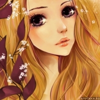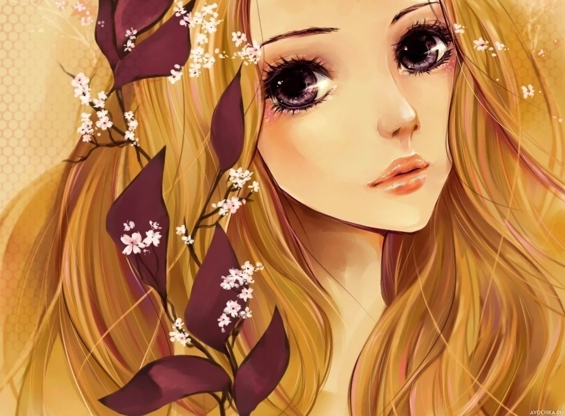 Рисунок с очаровательной рыжеволосой девушкой с красивыми большими глазами светло-фиолетового цвета. Вдоль волос девушки вьются красивые цветы, которые придают ей изящности и привлекательности. Скачать рисунок на аватарку с красивой рыжей девушкой.