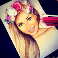 Картинка с портретом длинноволосой русой девушки с невероятно красивыми зелеными глазами. Поверх волос у девушки уложены цветы, которые придают ей романтический образ. Скачать аватарку с портретом красивой девушки.