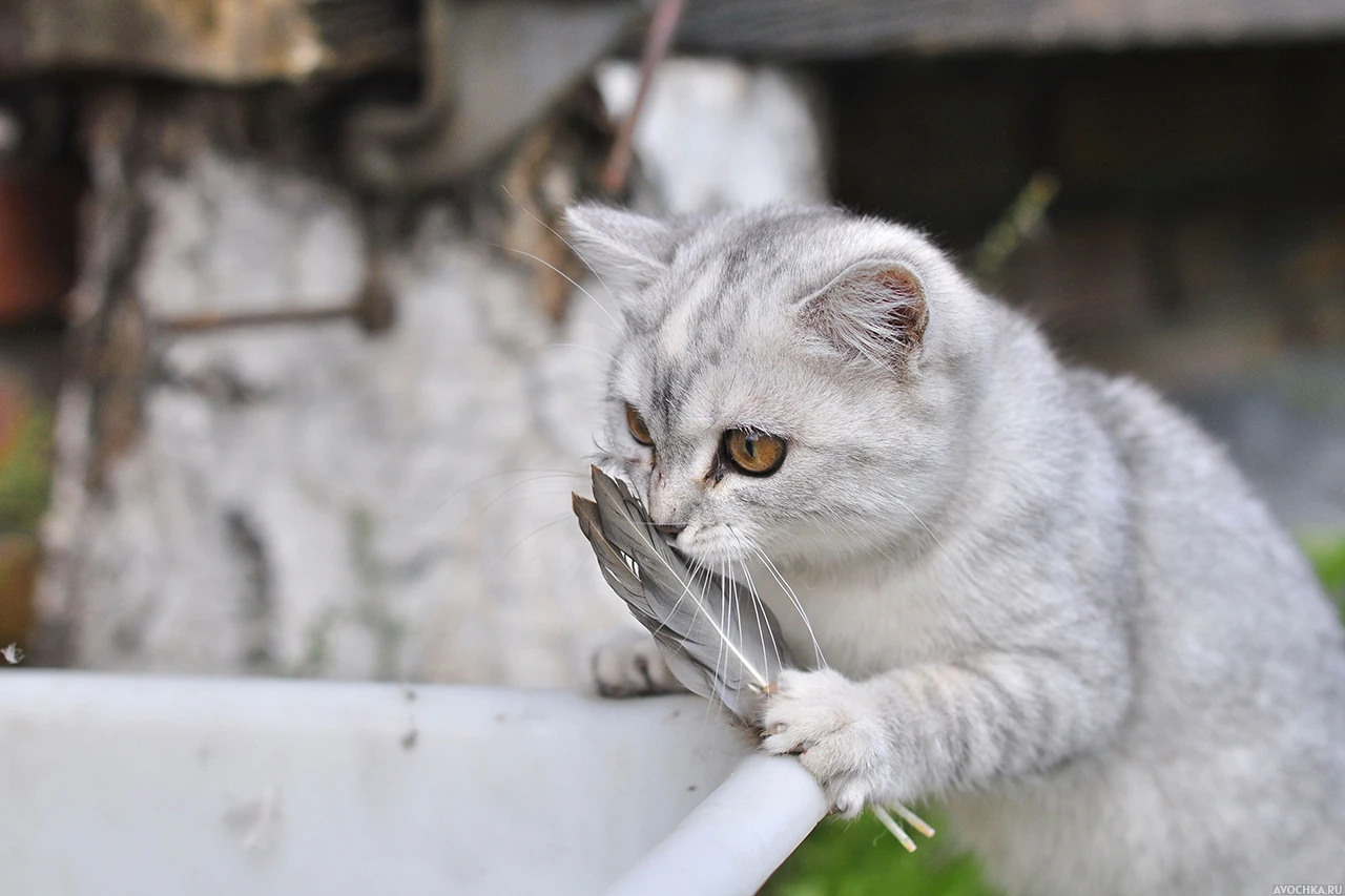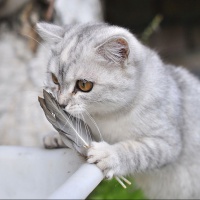 Аватарка с кошкой, которая держит в своей лапе и нюхает птичье перо. Кошки - прирожденные охотники, которые могут часами охотится за выбранной "жертвой". На данной картинке можно наблюдать как кошка нюхает перо птицы и пытается взять след для удачной охоты. Скачать аватарку с домашним охотником.