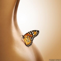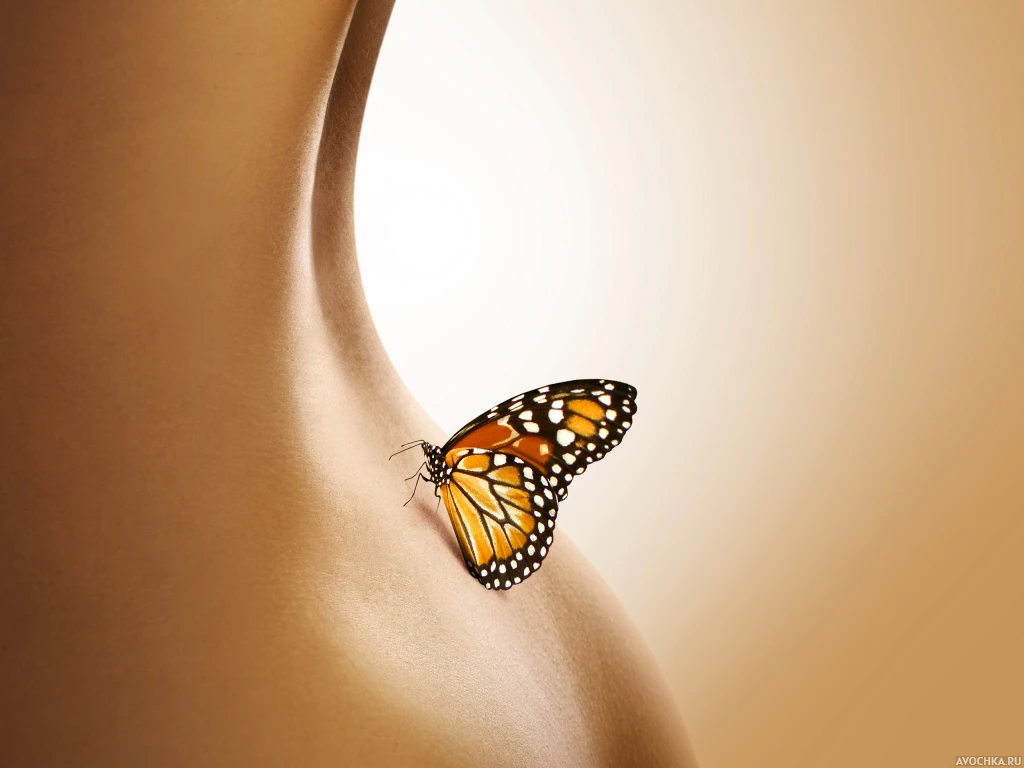 Картинка с красивой бабочкой, которая сидит на спине у стройной девушки. Фото подойдет для различных женских блогов и форумов на тему красоты, а также для любой девушки, которая хочет установить анонимный аватар.