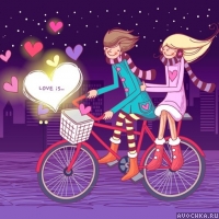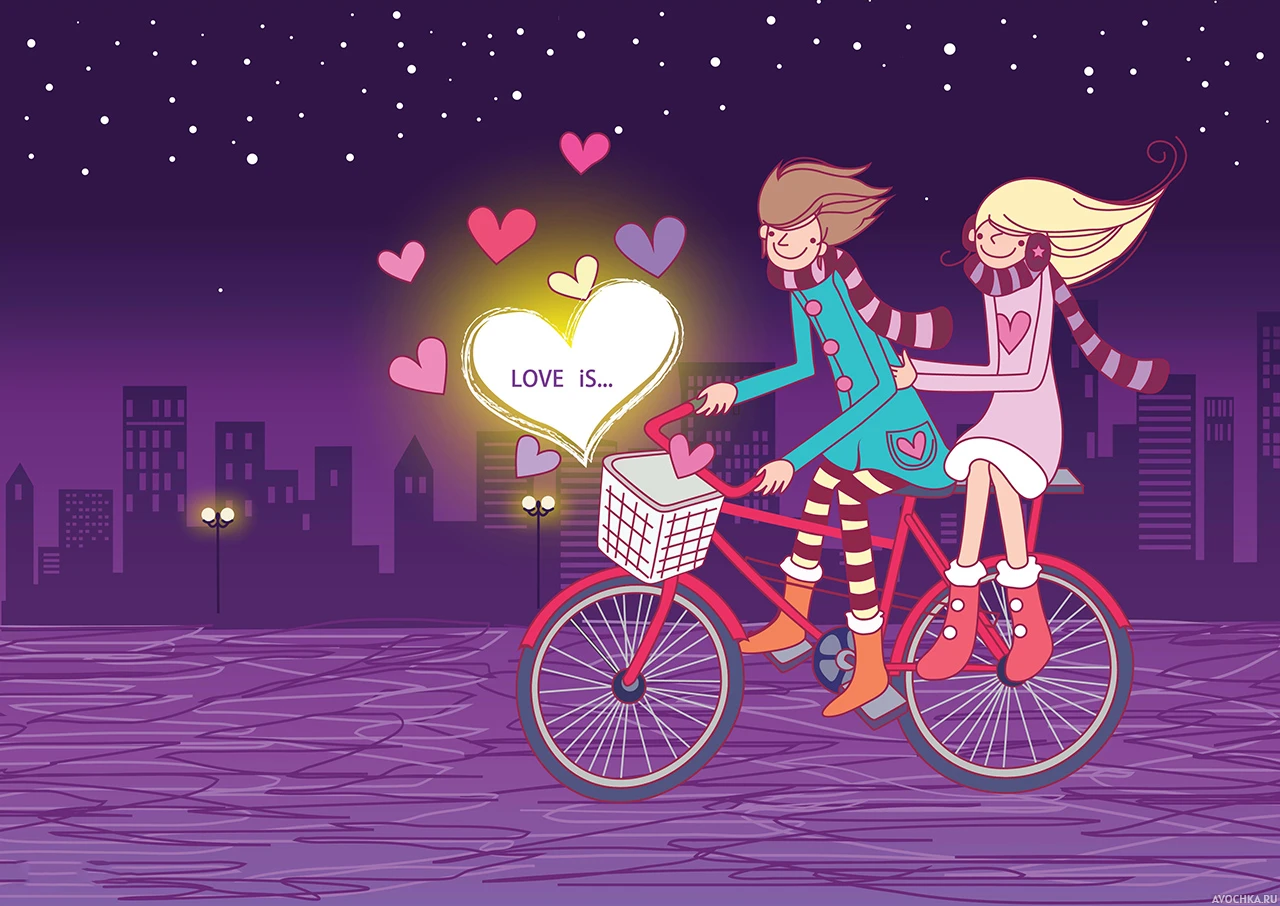 Влюбленные мальчик и девочка катаются на велосипеде. Что означает любовь? Это находить счастье и радость в любых моментах, которые люди проживают вместе. Беззаботность и легкость во всем. Картинка про любовь для людей, которых уже настигло это прекрасное чувство.