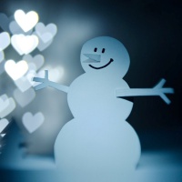 Аватарка с прикольным снеговиком с распахнутыми объятиями. Милый снеговик, сделанный из картона улыбается и с предвкушением ждет наступление нового года. Вокруг него мерцают сердечки, которые делают атмосферу предстоящего праздника наиболее радушной. Скачать фото снеговика для аватара.