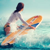 Яркая летняя картинка с девушкой со спины в воде. Девушка держит в руках доску для занятий серфингом. Прекрасный активный вид отдыха, который закаляет характер и помогает поддерживать хорошую физическую форму. Спортивные девушки всегда выглядят очень привлекательно. Если вы пока еще не занимаетесь спортом, то для мотивации можете скачать фото с девушкой в воде.