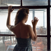 Фото с девушкой в платье, стоящей спиной у окна. Одинокая девушка смотрит за происходящим за окном - в кафе. Может быть она завидует сидящей там за столиком счастливой паре. Картинка на аватар подойдет любой девушке, так как не видно лица на фото.