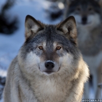 Зимняя аватарка с серым волком на фоне холодного снежного леса. За спиной хищника виднеется волчица, которая наблюдает за своим собратом. Взгляд волка сосредоточен на высматривании жертвы. Зимой они особенно нуждаются в хорошем и плотном питании, нежели летом. Скачать зимний аватар с волком можно бесплатно.