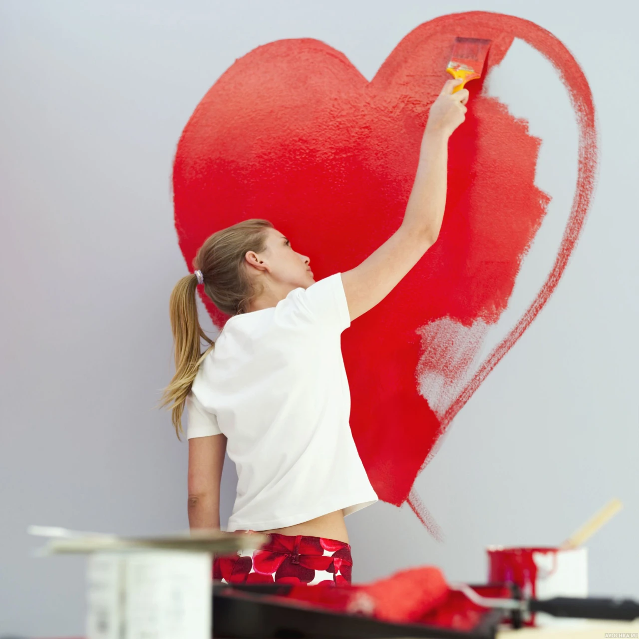 Картинка с девушкой в белой футболке, которая рисует красное сердце на стене. Живопись на стене - один из оригинальных способов выразить свое настроение или эмоции с помощью рисования. Так, например, девушка на фото пытается изобразить состояние влюбленности путем нарисованного красками сердца. А Вам не обязательно так заморачиваться, можете просто скачать фото с сердцем и поставить на аву.