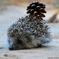 Картинка с ёжиком, на спине которого прикреплена еловая шишка. Удобно иметь множество иголок на спине и носить различные предметы на них. Но не все ежи обладают иголками. Есть и такие виды, у которых их нет, но выглядят они как большие крысы. На фото изображен ёж, которому повезло больше и он выглядит очень мило. Скачать фото с ёжиком на аву.