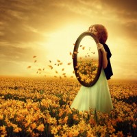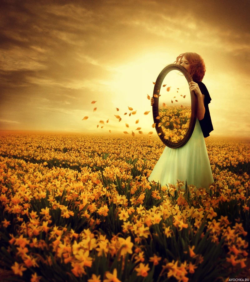 Скачать рисунок девушки с зеркалом, картинка с девушкой в цветочном поле