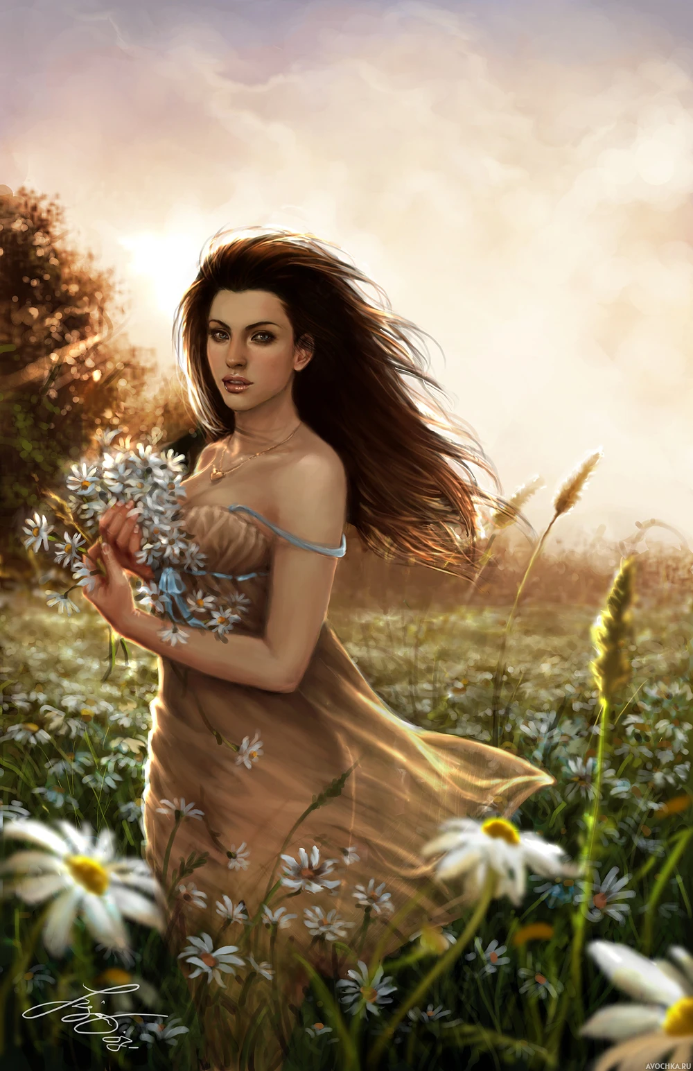 Рисунок девушки с ромашками на ромашковом поле
