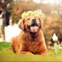 Картинка с жизнерадостным щенком голдена. На фото щенок темно-золотистого цвета с желтыми цветами на голове. Вокруг милого щенка окружает природа и белые цветы. Что еще надо для счастья собаки? Свобода, прогулки и свежий воздух. Скачать картинку с щенком голдена.