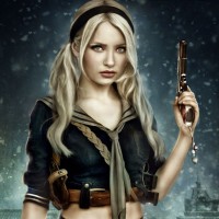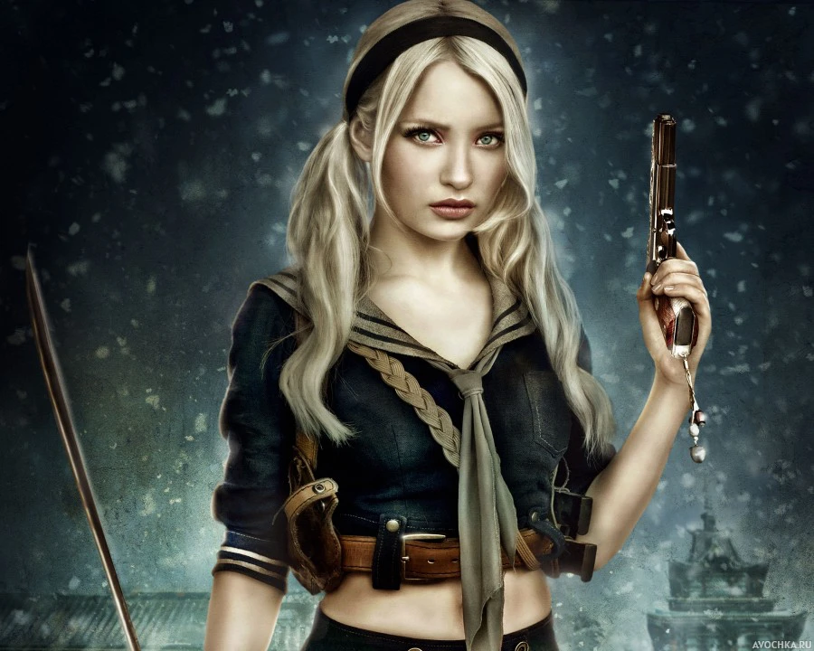 Картинка с девушкой из фильма "Запрещенный прием". На фото красивая девушка со светлыми волосами с черной повязкой на голове держит пистолет в руке дулом вверх. Скачать фото с девушкой из фильма.