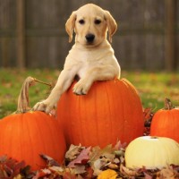 Фото с палевым щенком лабрадора с тыквами