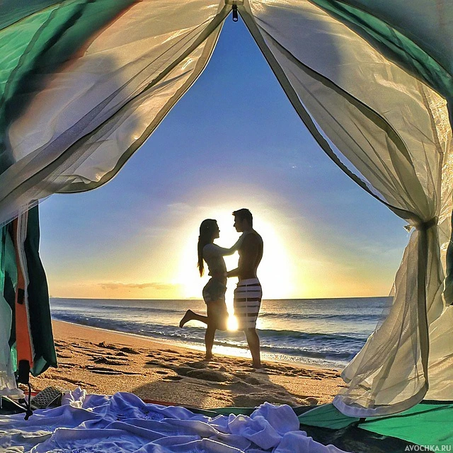 Картинка с видом из палатки на силуэт парня и девушки на берегу моря на закате. На фото девушка, подняв ногу, положила руки на плечи парню и смотрит на него. Фото с силуэтом можно скачать в качестве аватара для контакта или тематических форумов.