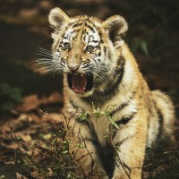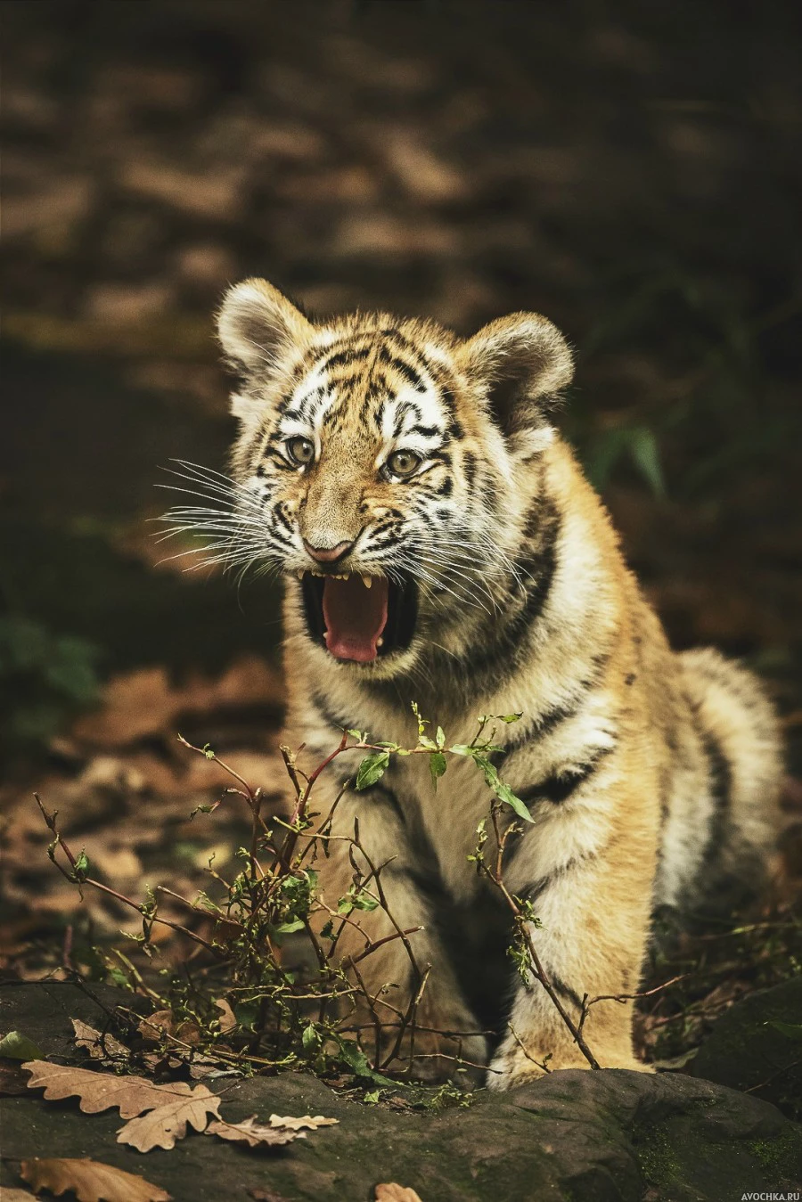 Картинка с милым тигренком с открытой пастью. На фото хищник хоть и не совсем взрослый еще, но уже представляет потенциальную опасность. Дикая кошка сидит открыв пасть и уверенно показывает, что с ней лучше не шутить. Скачать картинку с тигром с открытой пастью.