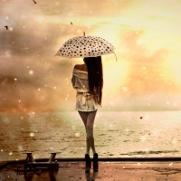 Фото с девушкой со спины с зонтом. На картинке девушка стоит в туфлях на берегу моря и смотрит на закат. В руках она держит зонт в горошек. Скачать фото девушки со спины на аву.