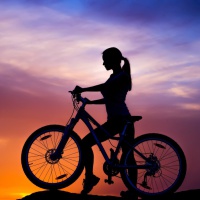 Силуэт с девушкой на велосипеде на фоне заката. На фото девушка с хвостиком на голове стоит на горе с велосипедом. Красивый закат вокруг. Картинка с девушкой на велосипеде подойдет для аватарки людям, которые ведут активный и здоровый образ жизни.