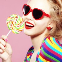 Фото с девушкой в очках в форме сердечек. На картинке девушка с ярко-накрашенными губами держит в руке разноцветный леденец, а на глазах у нее надеты красные очки в форме сердечек. Картинка яркая и эмоциональная заряжает позитивом и хорошим настроением.