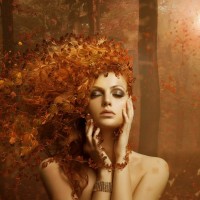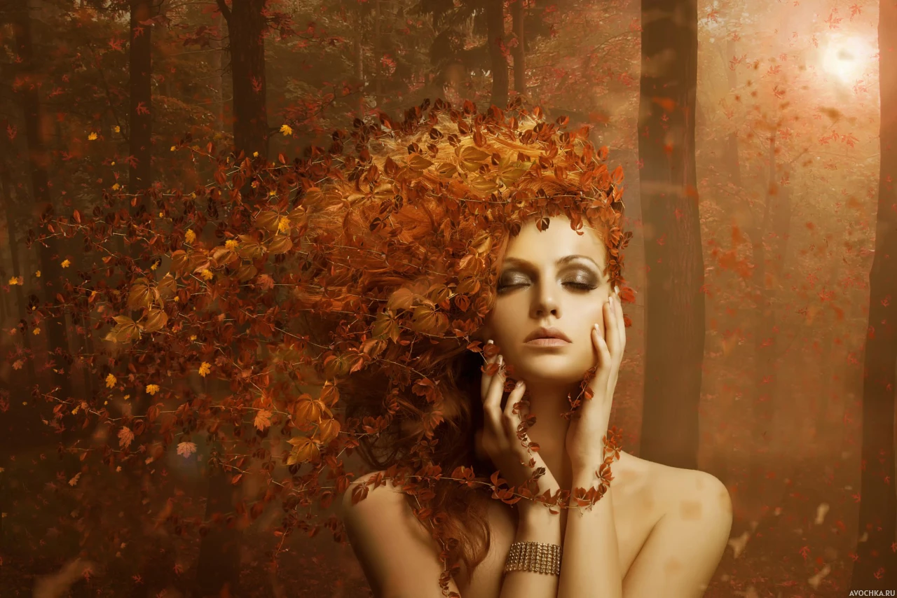 . Обнаженная девушка стоит в осеннем лесу с закрытыми глазами держа ладони возле лица. Необычное фото, у девушки вместо волос - рыжие осенние листья.