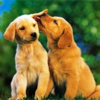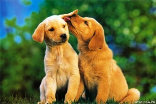 Картинка с двумя щенками золотистого ретривера. На фото щенок ретривера лижет ухо другому щенку. Выглядит очень мило и кажется, будто это влюбленная парочка. Картинки с щенками очень популярны и вызывают массу умилений. Аватарки с щенками обычно ставят люди, которые добрые в душе и жизнерадостные по жизни. Скачать фото с щенками золотистого ретривера.