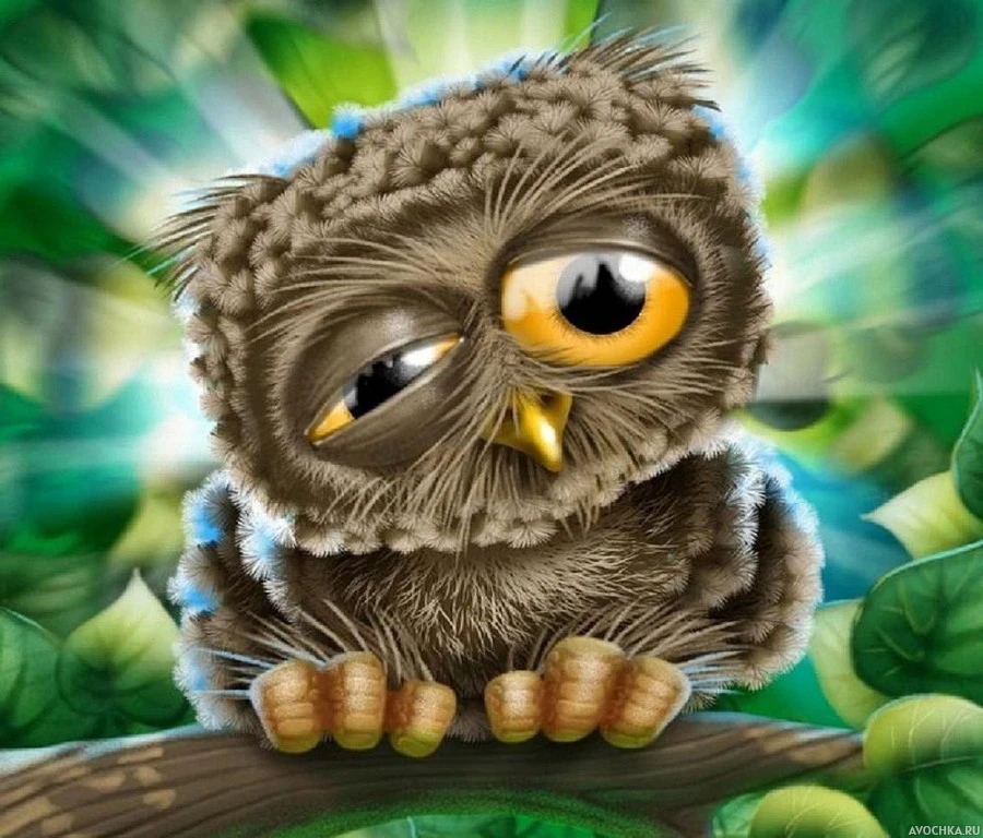 Рисунок с совой. На картинке сова сидит на ветке и устало подмигивает одним глазом. Есть стереотип, что совы считаются мудрыми птицами. На самом деле они не так умны, как попугаи или например, вороны. Совы считаются мудрыми из-за их ассоциации с греческой богиней Афиной. Она часто появлялась в сопровождении совы, поэтому эту птицу стали считать символом мудрости.