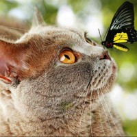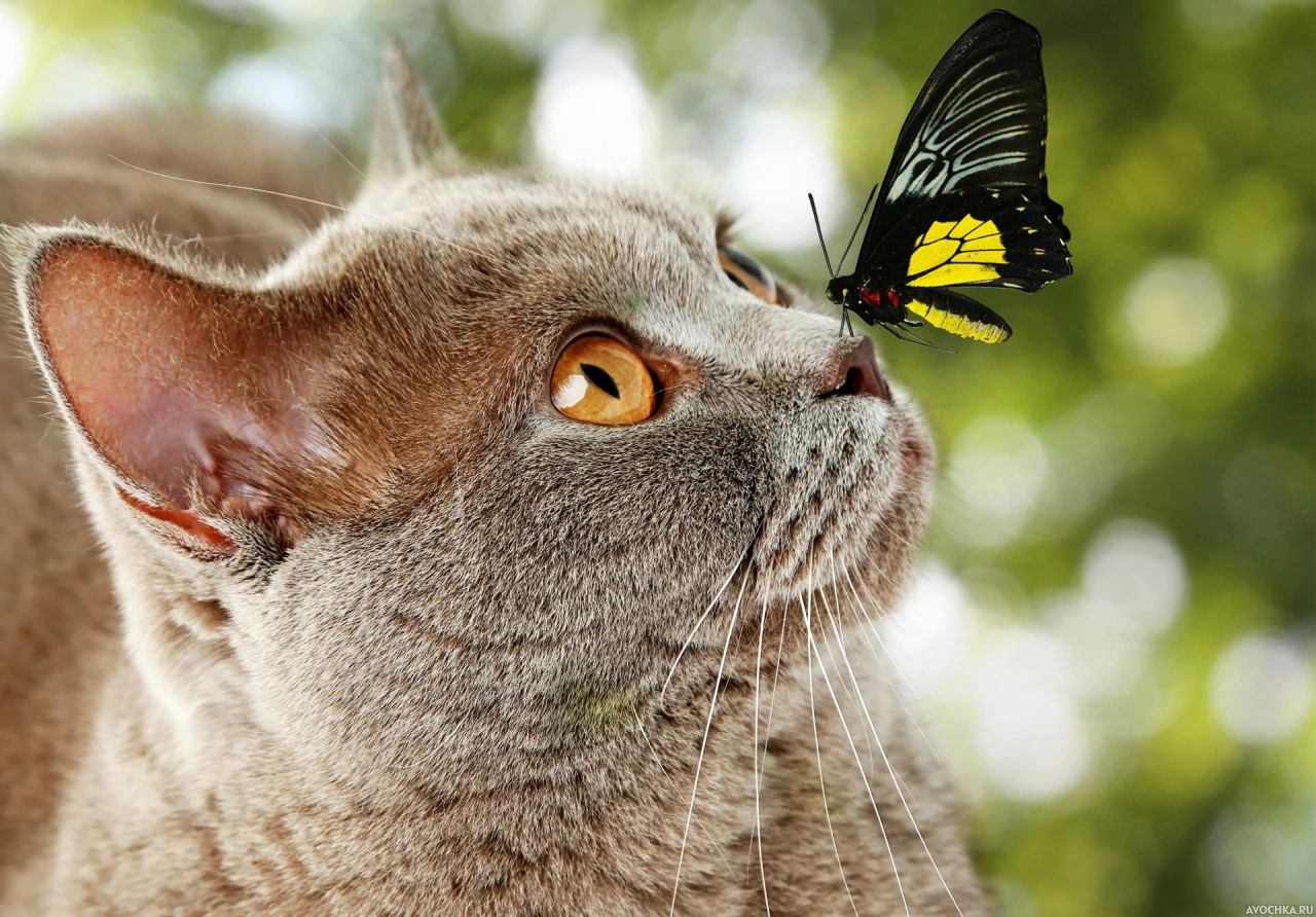 Картинка с котом с бабочкой на носу. На фото кот британской породы серого цвета. На носу у милого котика сидит красивая бабочка. Скачать картинку с котом с бабочкой на носу.