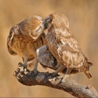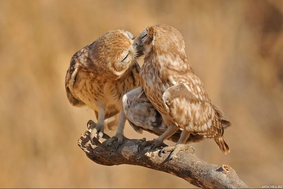 Картинка с влюбленными совами. На фото милая парочка двух влюбленных сов, которые сидят на ветке и целуются. Романтическая картинка с совами для влюбленных людей. Скачать фото с целующимися совами на рабочий стол.
