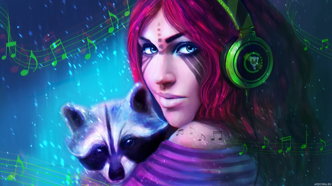 Рисунок с девушкой в наушниках. На картинке девушка с малиновыми волосам в наушниках держит енота на руках. Девушка наслаждается прекрасной музыкой, которая звучит из наушников. Картинка подойдет на аву для любителей послушать хорошую музыку. Скачать рисунок с девушкой на аву в контакте