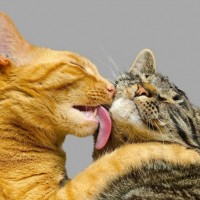 Кошачьи обнимашки. На картинке рыжий кот активно проявляет нежные чувства по отношению к полосатой кошечке. Кот обнимает и облизывает свою спутницу жизни. Обнимашки делают добрее не только людей, но и всех представителей живых существ. Скачать фото с влюбленными кошаками.