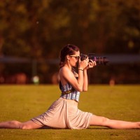 Картинка с девушкой фотографом. На фото изображена девушка, которая сидит на шпагате и фотографирует природу. Так, мы видим, что можно не только заниматься любимым делом, фотографируя все вокруг, но также использовать это время с пользой для себя, тренируя гибкость своего тела. Скачать фото с девушкой фотографом.