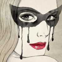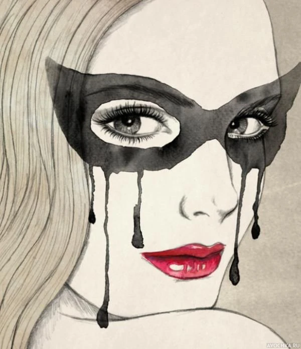 Рисунок девушки в плачущей маске. На рисунке изображена девушка в черной текущей маске. Рисунок отображает красивые черты лица девушки, большие выразительные глаза и яркие накрашенный губы красной помадой. Скачать рисунок девушки на аву..