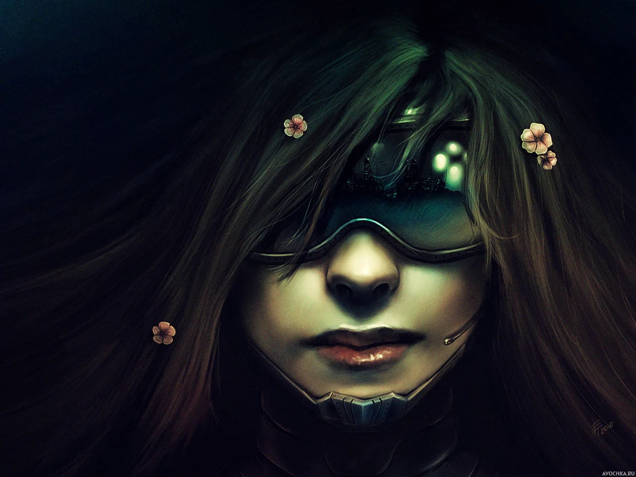 Фото с девушкой в очках. На картинке изображена девушка в очках, которые закрывают пол лица. В очках отражается ночной город с высотными домами и светящимися фонарями. Волосы украшают мелкие цветочки, которые крепятся к прядям. Интересную картинку с девушкой в очках можно установить на аву в контакте, если вы до сих пор не решили, что поставить. Очки прикрывают пол лица, поэтому никто не догадается, что на фото совсем другой человек. Скачать фото с девушкой в очках в стиле киберпанк.