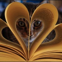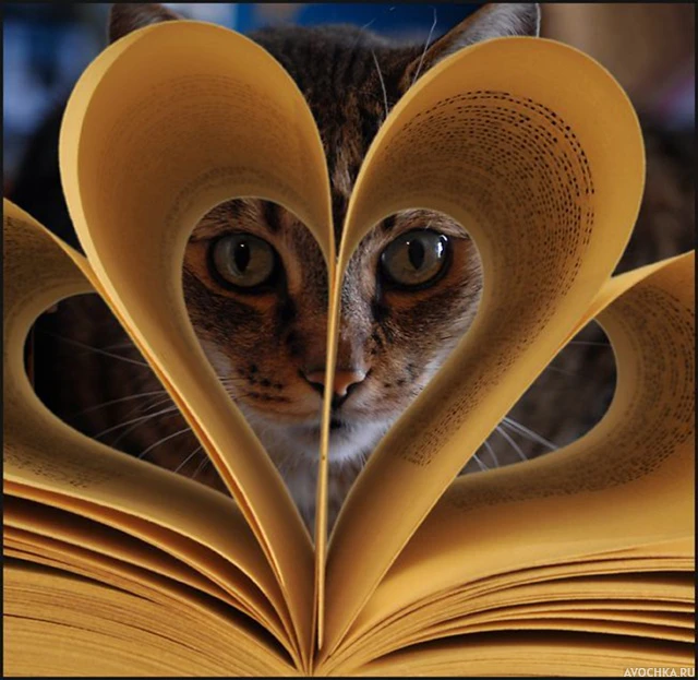 Кот, смотрящий сквозь книгу со страницами в форме сердца
