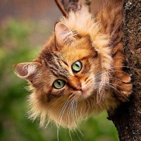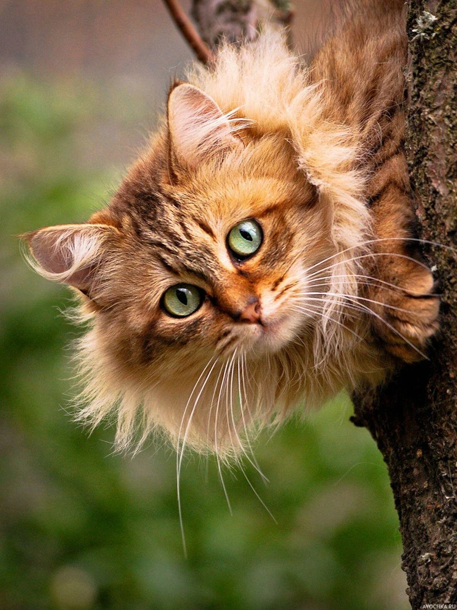 На фото изображен очаровательная кошка, которая сидит на дереве в лесу. Красивый нежный взгляд и светло-зеленые глаза говорят о доброте этого пушистого чуда. Один из интересных фактов о кошках: они не могут залезть на дерево вниз головой. Также, чтобы спуститься - им необходимо пятиться назад. Скачать картинку с кошкой на дереве.