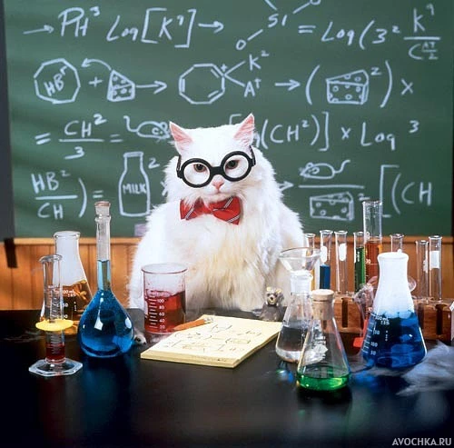 Фото с котом в химической лаборатории. На фото изображен кот-химик в очках и с бабочкой. Это не просто умный кот. Это ученый, профессор и доктор химических наук, который сделал огромный вклад в развитие химической науки. По крайней мере, он так думает. Скачать прикольную картинку с котом-химиком на аву.