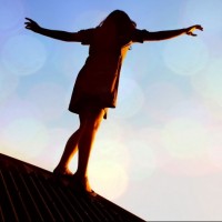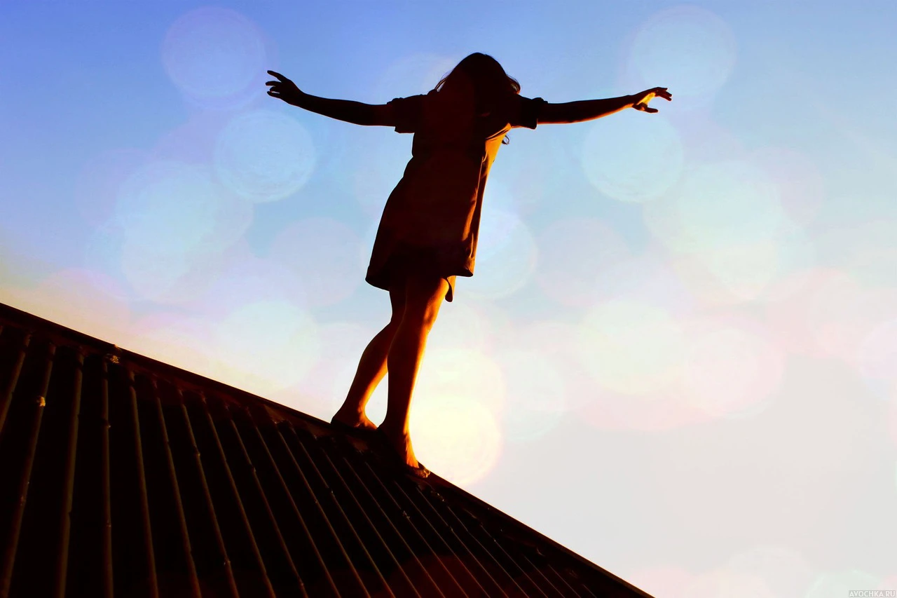 Девушка, идущая по крыше босиком. На фото изображена девушка, которая страдает лунатизмом и гуляет в спящее время по крышам. Девушка идет босиком по крыше, расправив руки в стороны. Скачать фото с девушкой