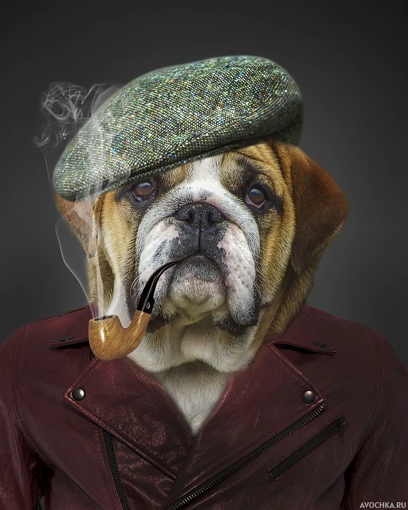 Прикольный портрет с собакой с сигарой. На фото изображен забавный крутой пёс с сигарой во рту. Пёс одет в кожаную куртку и с беретом на голове. Скачать прикольную картинку с собакой с трубкой во рту.