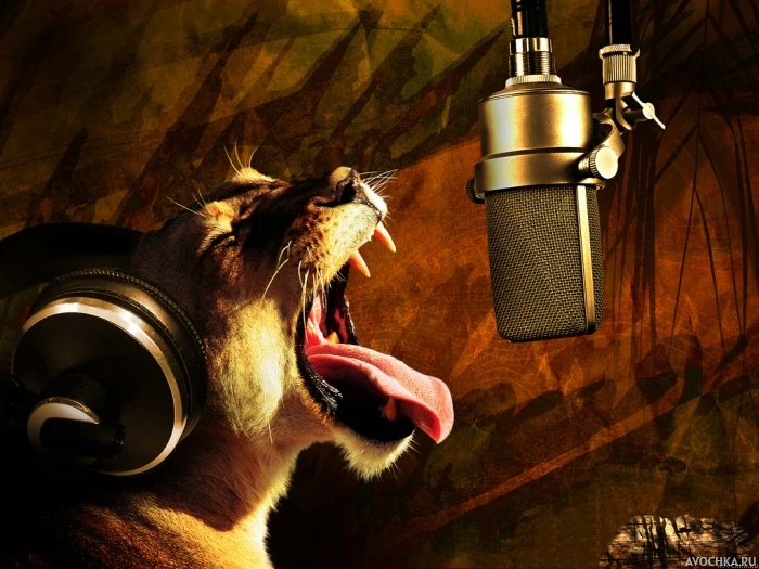 Фотография львицы-певицы скачать бесплатно. Поющая львица в наушниках и с микрофоном.