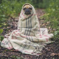 Фото с мопсом, укутанным в плед. На картинке изображен милый и забавный пёс породы мопс, который сидит в лесу, укутавшись в теплый плед. Еще не настали холода, а этот чудесный пёс уже позаботился о себе, чтобы не мерзнуть. Мопсы - смешные собачки, которые вечно что-нибудь вытворят, чтобы повеселить своих хозяев. Скачать прикольное фото с мопсом на аву.