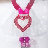 Красивое зимнее фото с девочкой, держащей сердце. На картинке изображена девочка по пояс, стоящая в красивом белом платье и куртке, которая держит в руках красное сердце. Скачать картинку на тему любви.